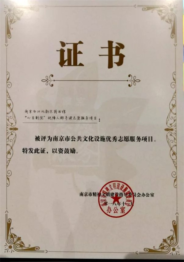 ▲“心目影院”视障人群导读志愿服务项目荣获“南京市公共文化设施志愿服务优秀项目”