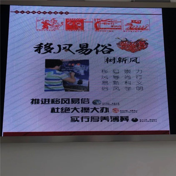 ▲电子屏滚动播放“核心价值观”、“讲文明树新风”、“移风易俗”等相关内容